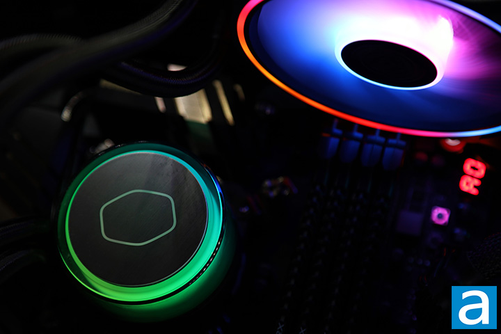 How well does the Cooler Master MasterLiquid ML240 Illusion stack up against the leading CPU coolers of today and does it give you all the rainbows you ever need? For the first part of the question, the MasterLiquid ML240 Illusion does indeed meet the cooling capabilities of the Noctua NH-D15 chromax.black and NH-D15S chromax.black in a single fan configuration. I am also impressed by how quiet the pump and fans are. In operation, the pump is almost inaudible. The dual Cooler Master MasterFan MF120 Halo remains to be very quiet at low RPMs and quite reasonable when spinning at high speed too. As I have mentioned on the previous page, in terms of sound emissions, the ML240 Illusion is a no doubt an excellent choice for quiet PC enthusiasts. For the second part of the question, this all-in-one cooler offers some cool lighting effects thanks to 12 addressable RGB LEDs on the CPU water block and 24 on each fan for a total of 60 across the system. Furthermore, if you do not have a motherboard with native ARGB support, Cooler Master actually includes a second-generation controller out of the box that can be software configured via USB using the company's MasterPlus+ software. So yeah, it will give you all the rainbows you ever need. With the bundled MasterGel Pro thermal paste, the Cooler Master MasterLiquid ML240 Illusion is quite the package. However, there is one glaring issue I have with this cooler. The included ARGB controller does not turn off after my computer turns off, which causes all the RGB LEDs on the cooler to remain on even when my PC is not. At least with my motherboard, it will also force all other USB devices to remain on that does not normally behave that way. This is a serious design issue. Also, as good as the cooling is, it is still a little bit behind the NH-D15 in a dual fan configuration. At an MSRP of $130, the Cooler Master MasterLiquid ML240 Illusion is no doubt a high-end option. But it also is, for the most part, an all-in-one liquid cooler that looks as good as it performs.