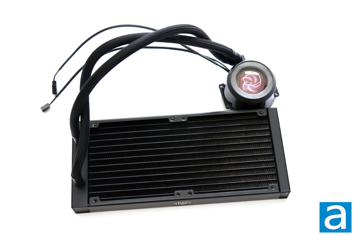 The radiator on the Cooler Master MasterLiquid ML240P Mirage feature a standard fin layout. Fins are placed in this manner so they come into contact with the liquid piping through its tops and bottoms. The result is a wavy set of fins. Heat from the liquid is pumped through the radiator and transferred to the fins through the contact points. Fans are attached on the radiator to dissipate the heat. The liquid is transported from the water block to the radiator via tubing. The tubing is made from an ultra-low evaporation rubber, measuring 400mm in length. This should fit in most standard midsize cases on the market, though it is possible this may be too short in some larger full-size towers. This depends on where you place the radiator in relation to the processor on the motherboard though, so your mileage will vary. The tubing is strong but flexible and should not form any kinks, even in extreme bending. The tubes also pivot slightly on the water block, allowing for an easier maneuverability should it be required. The tubes are covered with a braided cover to add a bit of a premium look.