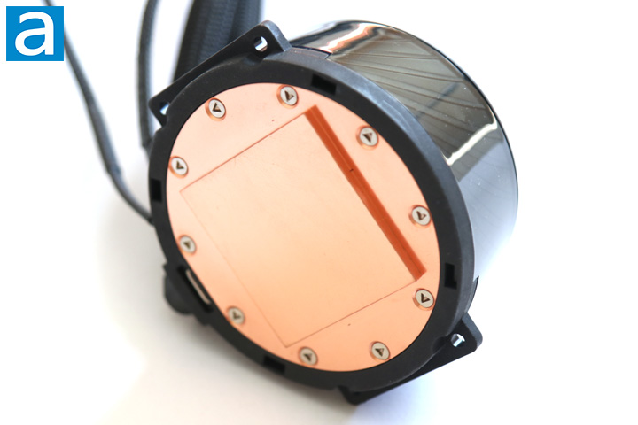 Going down the tubing, we get to the water block of the Cooler Master MasterLiquid ML240P Mirage. For the most part, it too has standard dimensions of 85mm in length, 80mm in width, and 43.2mm in height. A clear plastic shell goes around the rest of the pump to reveal some stylized lines. Internally, Cooler Master has advertised a dual chamber pump to carry water in and out. Otherwise, the base making contact with the processor is copper, which is expected. Copper is often chosen due to its excellent heat transfer properties. Four plastic holes on each corner are used to mount the included metal brackets for installation. Interestingly enough, this copper area protrudes out, rather than remaining flat overall. Otherwise, Cooler Master did have a plastic label on this area to protect it, but be sure to remove this label prior to installation.