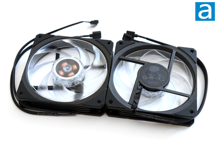 The two fans included with the Cooler Master MasterLiquid ML240P Mirage look to be variants of the MasterFan SF120R ARGB, especially as its specifications are close to the retail fan. Speaking of such, these fans have a speed range of 650 to 1900RPM. The rated noise level is a maximum 26dbA, though we will see what this means when we test for noise levels. Cooler Master has said these fans are created to balance between airflow and air pressure, as there is a decent amount of overlap between each consecutive fan blade. In addition, the fan produces an air pressure of 2.00mm H2O with an airflow rating of 59CFM. Otherwise, these fans also have rubber dampeners at each of the mounting points to soften vibration between the fan and the radiator. As you can tell by the fan name, these fans also have addressable RGB LEDs installed to make for a vibrant output. These fans have two connectors with one controlling the fan speed and power, while the other is used for the RGB header connection. The latter connects into the motherboard directly or the included RGB controller.