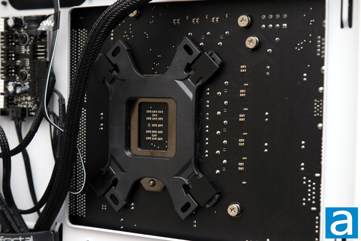 Installation of the Cooler Master MasterLiquid ML240P Mirage was as simple as any all-in-one coolers, but I will take you through a step-by-step walkthrough. The first step is to take the correct backplate for your system. A single backplate is provided for both of the consumer AMD and Intel mounts. As I am using an Intel test machine, you can see there are three different positions for the pegs, which cover the majority of the Intel sockets. AMD sockets can be mounted using the other arms on the backplate. Other sockets like the LGA20xx or AMD TR4 do not use this backplate, so you can use four screw pillars mounted directly to the motherboard. Slotting the backplate through the back of the motherboard is painless, as is securing the backplate with the four screws. Otherwise, the next step continues on the inside of the case.
