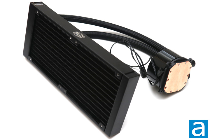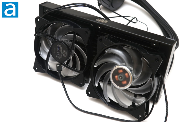 The radiator on the Cooler Master MasterLiquid ML240R RGB features a standard fin layout. The fins are placed so they come into contact with the liquid piping through its tops and bottoms. The result is a wavy set of fins. Heat from the liquid is pumped through the radiator and transferred to the fins through the contact points. Fans are attached on the radiator to dissipate the heat on the fins. The liquid is transported from the water block to the radiator via the tubing. The tubing is made from an ultra-low evaporation rubber, measuring 350mm in length. This should fit in most standard midsize cases on the market, though it is possible this may be too short in some larger full-size towers. All of this depends on where you place the radiator in relation to the processor on the motherboard though, so your mileage will vary. The tubing is strong but flexible and should not form any kinks, even in extreme bending. The tubes also pivot slightly on the water block, allowing for an easier maneuverability should it be required. The tubes are covered with a braided cover to add a bit of a premium look to the otherwise plain rubber tube.