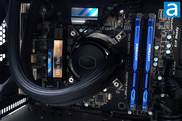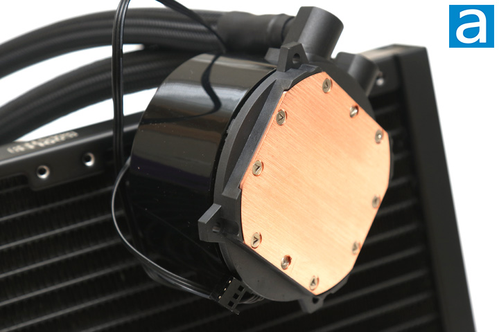 The next step would be to install the mounting screws on both sides of the water block. From here, you can either install the radiator and fans into the case or to mount the CPU cooling block in place. Personally, I mounted the radiator and fans first, as it can be quite unwieldy trying to mount the CPU block with a dangling radiator. Thankfully, my case utilizes a top mounted removable frame, so users can install the radiator outside of the case before slotting it in. Next, I mounted the CPU block in place with the provided thumbscrews. Cooler Master includes a small tube of thermal grease to apply to the processor. The last step is to plug all the connectors in place. I connected the power to a fan header and the fans to the motherboard.