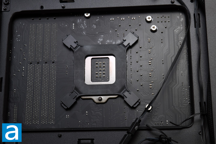 Installation of the Cooler Master MasterLiquid ML240R RGB was probably as simple as any all-in-one coolers, but I will take you through a step-by-step walkthrough. The first step is to take the correct backplate for your system. Both AMD and Intel backplates are provided with the ML240R RGB. For the Intel backplate, you can see there are two different positions for the pegs, which cover majority of the Intel sockets. If you are using an LGA20xx processor, four screw pillars can be used, since those motherboards do not require the backplate. Slotting it in through the back of the motherboard is painless, as is securing the backplate with the four included screws. Otherwise, the next step continues on the inside of the case.
