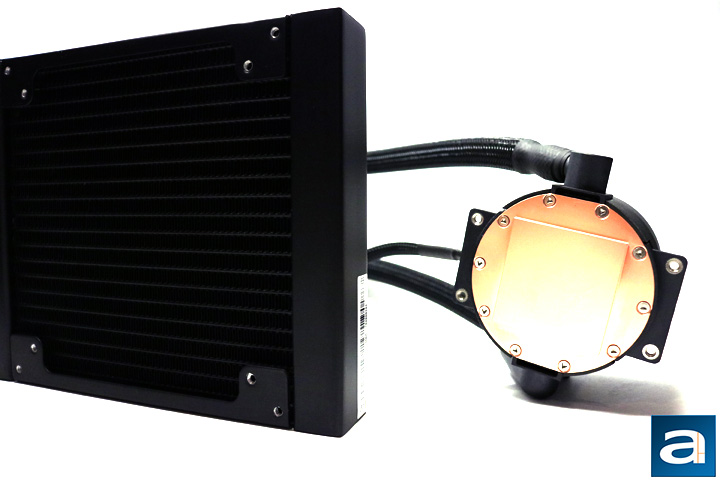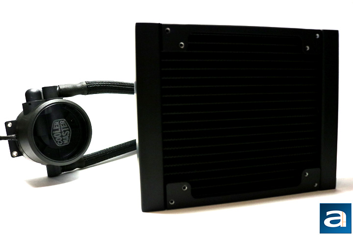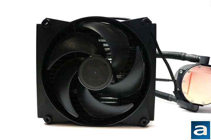 Fortunately, even though the Cooler Master MasterLiquid Pro 140 is a cooler designed for 140 mm fans, you are still able to mount 120 mm fans if you so please. The entirety of the cooler is a deep black color. Black is a nice choice, because it is fairly neutral in nature, and will most likely fit into any build's color scheme. As with many water coolers, it is a fairly simple design. The water block looks a little different with a transparent piece looking into the top of the water block. The Cooler Master logo is imprinted on it as well. This area also lights up blue creating a nice effect, however the light cannot be turned off.