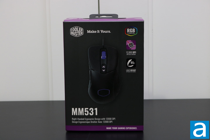 The retail box for the Cooler Master MasterMouse MM531 is different than its predecessor, the MM530. Most of Cooler Master's new products have this very sleek black and purple combination of colors, which in my opinion looks excellent. In the bottom left, we find the brand name and a brief description. Front and center is an image of the mouse, while a couple of features are highlighted in the top right, namely, the lightweight design, its RGB functionality, and 12000 DPI sensor. The rest of the retail box contains some more detailed information, while the purple and black color scheme is continued.