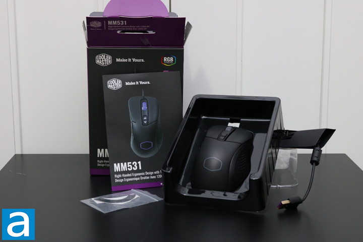 After opening the MasterMouse MM531, we find a couple of different things. Surprisingly, Cooler Master included two extra Teflon feet. I guess if this mouse starts slowing down due to the feet being worn out, then Cooler Master has you covered. Otherwise, there is a brief but effective manual which details getting the software downloaded while also explaining the two year warranty. Beyond that, the MasterMouse MM531 sits snug in a plastic mold, which keeps the mouse moving during transportation. Cooler Master has done a good job with its packaging.