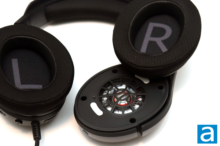 Starting at the ears, the cups are wrapped in a mesh fabric with an adequately thick amount of foam. The foam has a sufficient amount of give to be comfortable without collapsing. The Cooler Master MH650 ears are oval to fit most ears. Under the mesh, we have a thinner fabric marked with L and R to indicate the orientation of the headset. This thin layer also prevents users from feeling the plastic frame underneath. At the heart of the MH650, under the thick ear cups, are the 50mm neodymium drivers. According to Cooler Master, these drivers offer a frequency response range of 20Hz to 20kHz, which matches with the audible frequency for humans. They also have an impedance of 32 ohms and a sensitivity of 110dB. Otherwise, the ears sit between two arms that allow them to tilt about to fit to your head. The ears on the MH650 can rotate around and be turned so that they rest flat if you wear the headset around your neck.