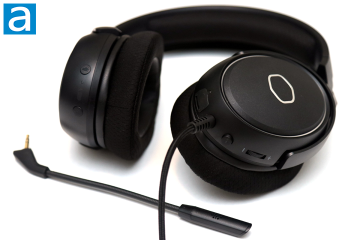 At the bottom of the headset are where a handful of useful controls and inputs exist for the Cooler Master MH650. Starting on your left ear, which is the right side of the photo, you have a volume scroll wheel, microphone mute button, and an opening for the included 3.5mm microphone. The volume wheel allows you to adjust the volume independent of the system it is plugged into, and offers enough resistance so that it does not move when you brush your hand against the headset. The microphone mute button is a push button that stays recessed when it is muted. Unfortunately, we do not have the same audio or visual feedback when you mute or unmute the microphone. Meanwhile, the microphone hole is covered by a rubber flap that opens up when you want to use it. On the right ear, you have two buttons flanking around a small LED light. The first button closer to the back is marked "7.1" which refers to the switch used for activating the virtual 7.1 surround sound. The other button is marked with a light bulb to rotate between several RGB lighting patterns on the MH650 or turn it off altogether. You can also see Cooler Master has used the same enclosure for the headsets, as there is a cutout for what would have been the micro USB port on the wireless headset. Instead, this hole has been filled back in.