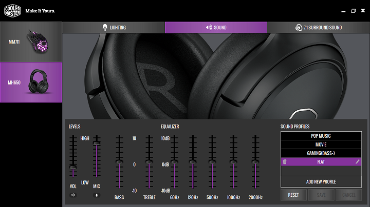 The software experience for MasterPlus is pretty straightforward with configuration and settings for the Cooler Master MH650 split into three tabs. The first tab is marked Lighting and it lets you set the lighting color for the RGB lights on each side of the headset. You can choose between a standard color cycle or a single-color static or breathing pattern. You can also turn off the lights if you find them distracting. There is not much customization here, but it is not a big deal considering the user will not be able to see this light anyway. The second tab is marked Sound. This area lets you change the different levels for volume and microphone as well as set equalizer settings for your headphones. You can save them into a profile for quick recalling. The third tab is marked 7.1 Surround Sound, which lets you configure the virtual surround experience. When it is active, you can change the perceived location of the seven virtual tweeters as well as the single virtual subwoofer. You can also rotate the orientation about. Overall, it is pretty neat to see this, and those who would like to tinker with it are given the opportunity to. Otherwise, I do not have any complaints about the MasterPlus utility, as it is an intuitive application to use.