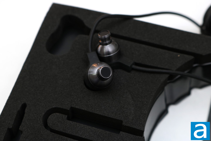 Without the sleeves, you can get a better idea of how big the earphones actually are. The brushed aluminum continues on throughout the entirety of the earbud as pictured above. Inside of the earbuds is where the real magic happens. The drivers are 10mm in diameter with a frequency response of 20 to 20000 Hz. The impedance come in at 16 ohms. The specifications are quite standard, but we will have to see how they perform in real life on the next page. The Cooler Master MH703 earbuds also feature an omni-directional microphone with a frequency response of 100 to 1000 Hz. We will also be testing the microphone on the next page. There is a small in-line control box to have some basic controls over music and phone calls, which is a nice addition to the earphones.