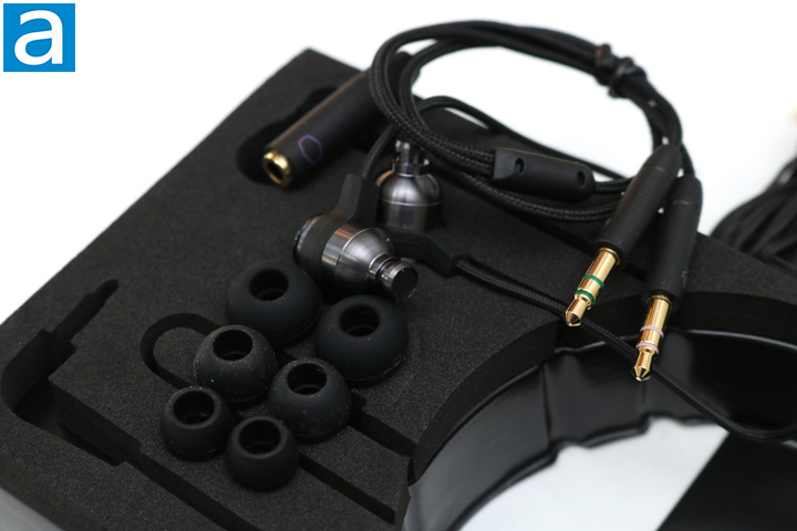 The Cooler Master MH703 comes with a few different accessories. There are three different sized silicone ear tips, which should fit anyone's ear. I generally opt for the smallest one as they sit the most comfortably. Otherwise, since you are also supposed to be able to game with these earphones, there is also a splitter cable to split the normal 3.5 mm audio connector into an audio and microphone connector. As well, all the cabling is braided, but unfortunately they are pretty prone to tangling. The normal 3.5 mm audio jack connector is a right angle connector and supported by a substantial amount of hard rubber to ensure nothing breaks. All the connectors are gold plated. Overall, the Cooler Master MH703 is built well and has some good specifications. We will have to see how it performs on the next page.