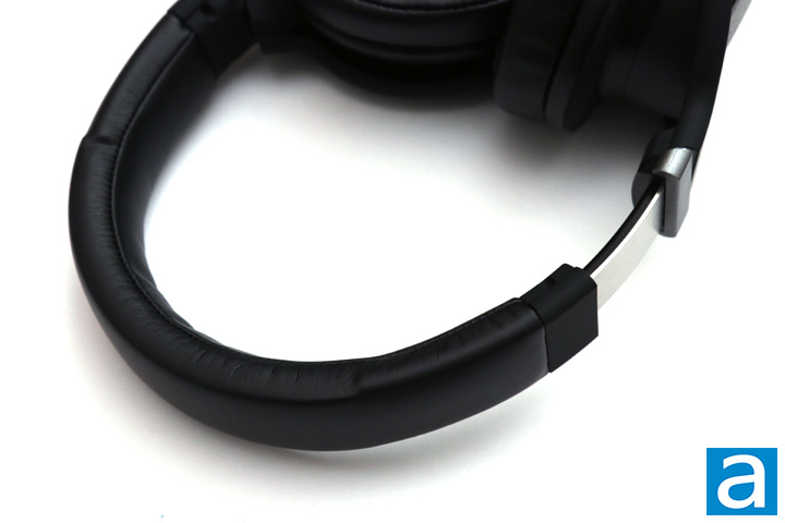 Flipping to the top of the Cooler Master MH752, you can see the headband. As we previously mentioned, this area is wrapped in bicast leather with a foam layer above and below the steel frame. I found this offered sufficient padding from preventing any pressure being felt at the top of my head. As for adjustments, you can increase the size of the headphones by extending the ears down on each side. Both sides are notched and provide enough friction from accidentally slipping out during use. I would have liked these notches to be marked on the headset with some sort of visual indicator. Otherwise, I like the exposed steel here, as it sticks with the clean and classy look.