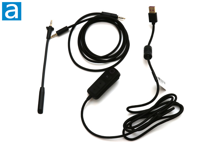 All of the inputs can be found on the extra cables provided by Cooler Master. Starting with the microphone on the left, this is an omnidirectional one that plugs into the left side of the headphones. It has a frequency response of 100Hz to 10kHz with a sensitivity of -42dB and a signal-to-noise ratio of 55dB. It is also placed on a very flexible boom arm, which can bend and stay whichever way I leave it. Next, we have a braided 3.5mm to 3.5mm cable measuring 1.5m in length. Cooler Master designed this cable to plug into the left side, but also lock in there with some neat plastic molding. This way the cable should not be coming out unintentionally. The braiding and the cable is pretty flexible, though not as smooth as some we have seen, such as the one on the Sennheiser GSP 500. Finally, we have the USB control box, which can be used if you plug the Cooler Master MH752 into your computer. On the unit itself, we have several controls. At the top we have a button marked 7.1 to enable and disable the virtual 7.1 surround sound. This button lights up red when it is enabled. Underneath, we have a single volume rocker to let you change the volume on the fly. As this is a USB unit, this will adjust the volume on your PC directly. On the left side of the controller, we have a switch to mute the microphone, while the volume rocker below lets you adjust the input volume of the microphone. Finally, on the back we have a plastic clip to let you fasten the USB sound card to your shirt so it does not dangle about. Otherwise, the attached braided cable leads out to a gold plated USB cable and measures 1.5m in length. This makes for a total of 3m of usable cable when plugged into a computer.