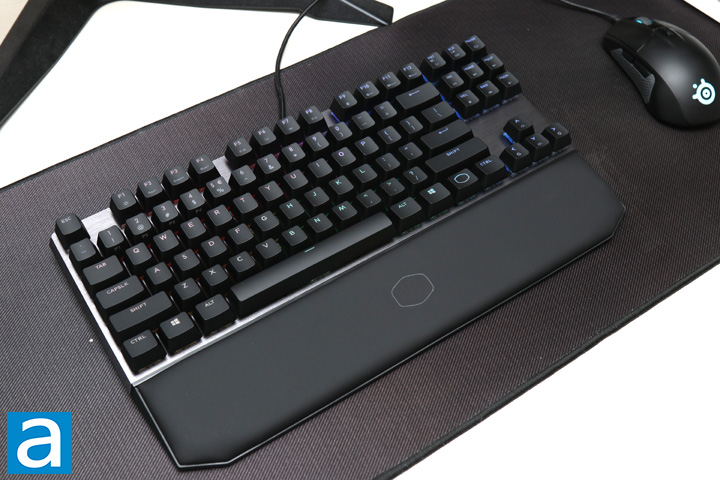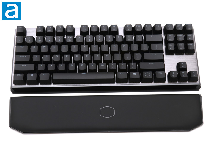 One thing I like about Cooler Master keyboards in general have been how minimal they look. Obviously, some may not love this, but I think this gives their keyboard a fresh look. Cooler Master has kept this keyboard clean by only having the Cooler Master hexagon outline around on the Function key and in the wrist rest. As you can see, the keyboard follows a silver and black color palette, with a brushed aluminum backplate shining under the black key caps and wrist rest. At the front, we have a glossy black area too, which conceals the magnets to hold the wrist rest and some lighting, as we will see later on. Otherwise, you can see once again the MK730 uses an island-style design, with an exposed backplate and switches and keycaps placed above this backplate. This exposes the switch for better backlight spill. Overall, the MK730 is nothing new, especially since it is essentially a tenkeyless version of their full-sized MK750. However, I am glad to see they made this, especially as a person who loves these smaller keyboards.