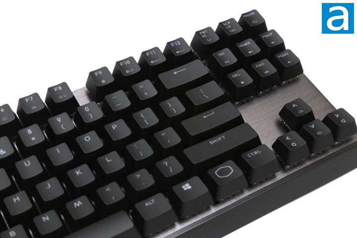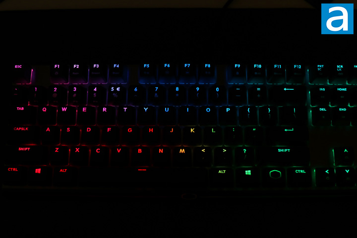 The Cooler Master MK730 arrived in a standard 87-key QWERTY ANSI layout. The overall layout looks exactly like any typical tenkeyless board, which means a regular keyboard minus a number pad. The bottom row is a standard layout, which means all of the keys besides the space bar are the same width. In addition to removing the number pad, Cooler Master also removed the indicator LEDs. These are now partially integrated into the lighting of the Caps Lock and Scroll Lock. If the lights are turned on, all of the lock keys will be turned on. When either lock is first pressed to activate them, it will stay lit up. However, when you press it again to deactivate it, the light will turn off for a few five seconds before it resumes the regular lighting. This behavior also varies based on the backlight patterns, but we will see all of these patterns later on. It would have been nice to see an indicator for Windows lock however.