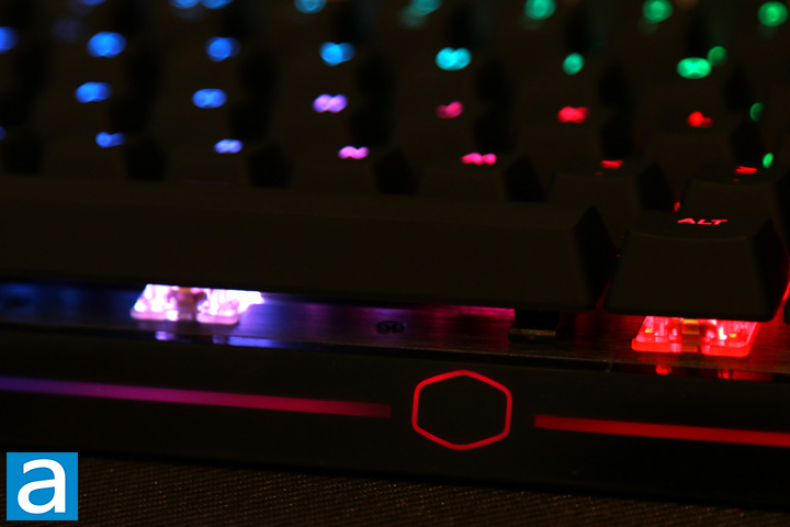 When it comes to lighting, there are quite a few ways to customize the lighting effects on the Cooler Master MK730. The clear housing on each switch allows the lighting to shine out and bounce off the bottom of the backplate. The lights shine through the keycaps, but the second row is not as well illuminated. This is because the light is located at the top of the key switch rather than the bottom. What I do like is the amount of customization, in both colors and effects, you can do without using the software. This is the same system Cooler Master has employed with their other keyboards and I really appreciate it. If you scroll down a bit further to the last photo, you can see Cooler Master has also kept the front lighting bar that lights up in sync with the rest of the keyboard. While it would have been nice to change this lighting area separately from the rest of the keyboard, I like the subtle way it glows and it makes for a really unique look.