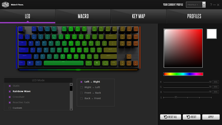 If you still want more customization or macro recording, you can download Cooler Master's software. First, you should download Cooler Master Portal, which is 9MB in download size. It should be noted there are two versions of this, but they are not cross-compatible, so be sure to download the correct one. This really confused me, especially since I expected Cooler Master would try to make everything into one application. In total, the Cooler Master Software took up about 65MB of space on my computer after installation.