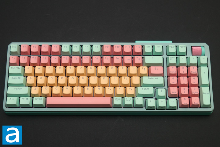 On first glance, the Macaron edition of the Cooler Master MK770 is truly a splash of color. In a world of all-black or all-white keyboards, it is about time we finally see something else. On the other hand, there are some interesting choices to the colors. The surrounding body of the MK770 is in teal, although there is a darker shade at the top and a lighter shade underneath. Around the body, we have some pink accents on the sides, volume knob, and on the keycaps. Finally, the inner alphanumeric keys are marked with a tan color. I think Cooler Master could have made the color themes a bit more unified, but I guess for those that like all of these three colors, this fulfills the job. The design of the MK770 follows a more traditional look with its plastic frame that surrounds the keys and their switches. Cooler Master branding is generally kept to a minimum, although we can see the Cooler Master outline on the function key and the name on both sides of the MK770.