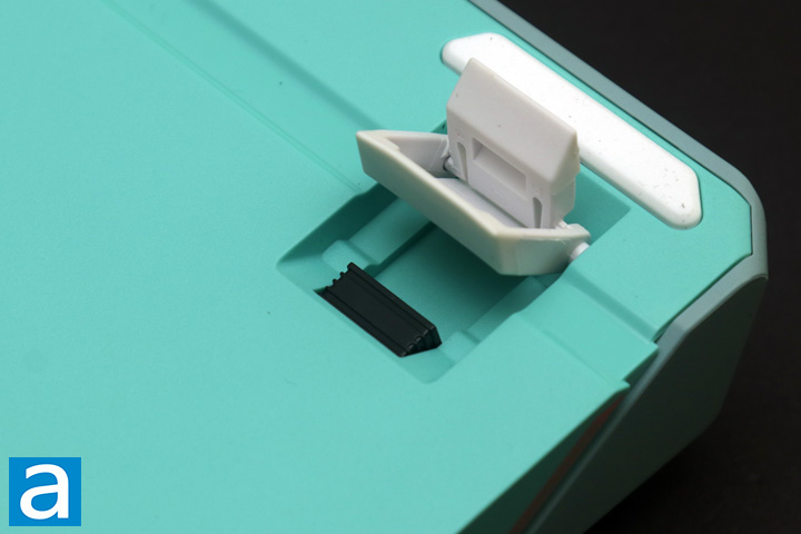 On the flip side of the Cooler Master MK770, we have a label to mark the serial number. At the bottom, we also have some certifications printed on the plastic directly. At each corner, we have rubber pads to provide grip between the keyboard and the surface it sits upon. At the back, we have a pair of feet on both sides that extends fully out. These feet are of different heights, so you can raise the keyboard halfway up. The feet are also finished with a rubber end to keep the whole board in place without any concern. One other neat thing is that they put a rectangular slot under the left side foot for you to store the USB receiver when it is not in use.