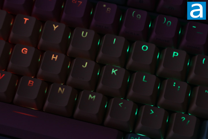 As for the lighting on the Cooler Master MK770, we do have a full set of per-key RGB LED lighting, and it looks decent. I will say the colors of the keycaps do slightly affect the perceived accuracy of the colors, but I found the north-facing lights to shine through well. There are some keys with two rows of font, especially on the number pad, so the light does not shine through at all on the bottom legends. Otherwise, we do have a full RGB selection of colors for you to make it the way you want. The lights bleed through on the edges, but it generally keeps everything bright. I did notice the light under my F7 key seemed to be dimmer than the rest. I think this is a quality control issue, whether it is with this one or with the early batches of keyboards, and it is unfortunate to see this.