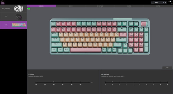 As for its wireless capabilities, Cooler Master says there is a 4000mAh battery inside to power the MK770 while operating wirelessly. In order to extend the battery life, Cooler Master has included automatic sleep options, which you can change in the software utility. When it is sleeping, the lights will turn off. However, once you press any key, it will automatically wake back up from sleep. In our testing, the Cooler Master MK770 lasted just over two days of on and off usage with lighting turned on full brightness. This was not continuous use, and each day varied in amount of use. I did leave it on overnight, but it automatically goes to sleep when it detects the computer is turned off. On the other hand, with the lights turned off, the keyboard functioned for around ten days before needing a recharge. While this is longer, I think the overall battery situation is short with the MK770.