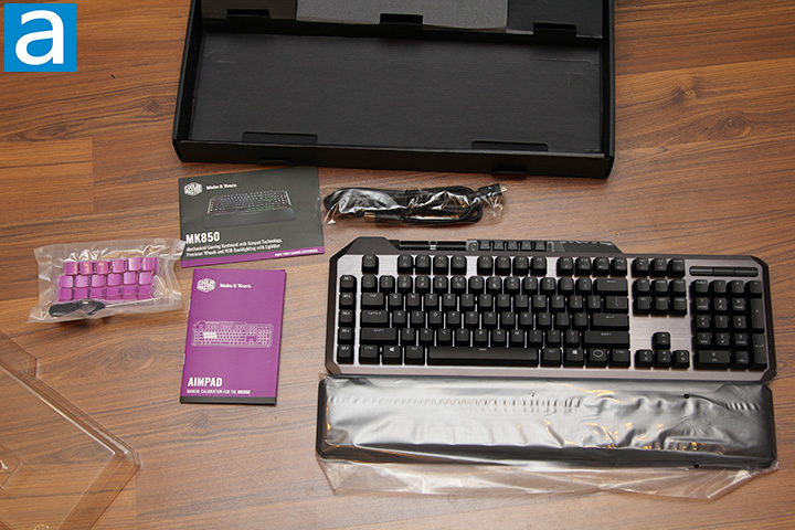 Out of the box, you will receive everything you need plus a few other things that are really nice to have. Securely placed inside the box is the Cooler Master MK850 keyboard itself behind a clear plastic cover. It even comes with a detachable PU leather wrist rest. A keycap puller and fourteen purple PBT double injection keycaps are placed inside a sealed vacuum bag. The extra keycaps are QWERASDF, Esc, M1 to M5, and the arrow keys. A USB Type-C to USB Type-A cable is included inside a separate compartment at the bottom. On the product literature side, you will find a quick start guide that shows you what some function key combination do as well as an Aimpad calibration manual.