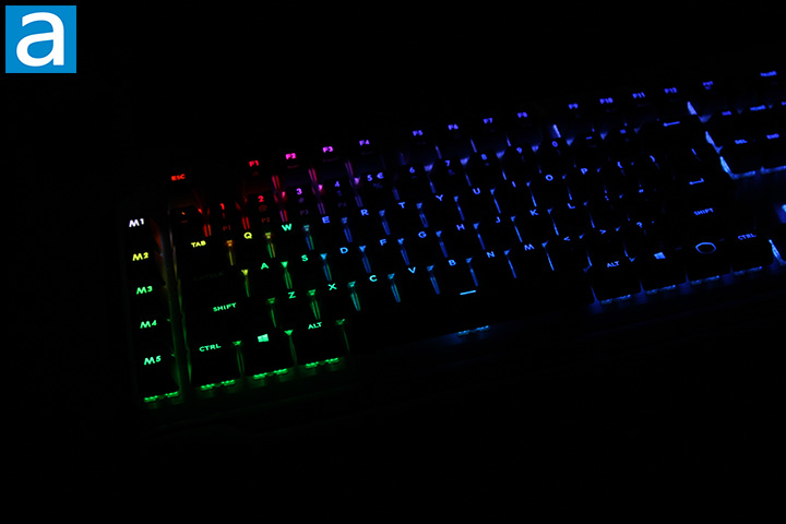 I am a big fan of fully backlit keyboards and I am happy Cooler Master designed the MK850 with this feature. The Cooler Master MK850's key illumination distribution is reasonably even for the most part. The area between the keys are also backlit thanks to the reflection of the LEDs, and I like it. One thing to point out, for keys with more than one line of text label, you will notice the top half is significantly brighter than the bottom half. This is due to physical design limitations of Cherry MX stems, as you can see in our photo above.