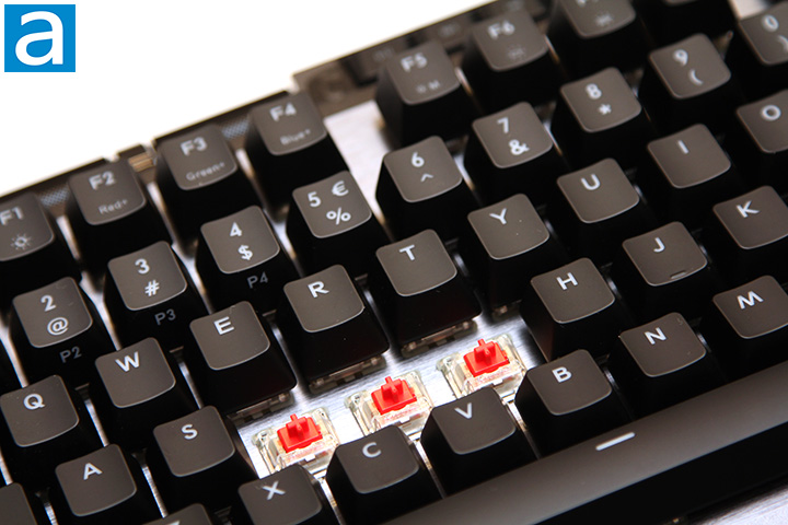 On the left, five Aimpad profile keys labeled M1 to M5 allows you to switch between standard, first person shooter, driving/flying, advanced flying, and speed modes, respectively, where the latter gives high actuation points on all Aimpad keys. Hitting the Function key along with the labeled F1 through F8 buttons and arrow keys allow you to do things like cycling through different lighting effects picking individual lighting channel intensity. Fn and the arrow keys control the lighting effect speed and direction. Fn in combination with F10 to Pause are for macros. You can even switch profiles, stored on the keyboard's 512KB internal memory, by going through Fn in concert with 1 to 4. Fn in combination with F9 is toggles Win Lock on or off. Win Lock is an important feature in any gaming keyboard, because let us face it: How many times have you tried to duck in your favorite FPS while engaging an enemy, only to be killed instantly, because you missed the "Ctrl" key and your game was minimized? Hit the same key combination again and you can even lock the whole keyboard.