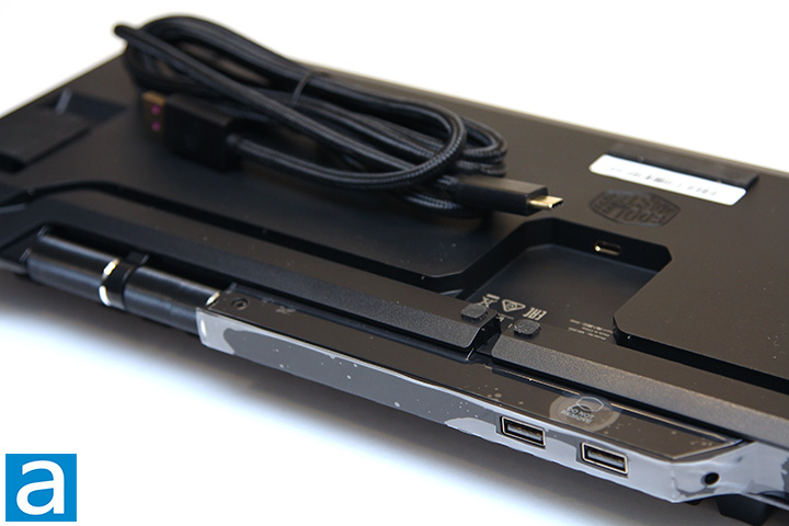 At the back of the Cooler Master MK850 is the USB Type-C cable lead out. It comes out in the center and is detachable. The cable can be routed through the left or right side of the keyboard in addition to the middle thanks to the integrated tracks. This braided cable is of average thickness and extends 1.8m in length to connect to your computer via one standard, non-gold-plated USB Type-A connector. When we bring about the question of whether gold plated connectors are actually useful or not, let us just say if it was the actual pins, then possibly -- since gold offers better conductivity than other metals. This theoretically establishes a better connection with your computer, but on a digital signal level, we must understand it is a discrete one or zero; if anyone tells you they can tell the difference, you can defeat their theory with a double blinded test. Additionally, if you are referring to the gold part of the connector you see on the plug, I would like to point out it does not make any physical contact electrically with your computer. In other words, it is nice to have and it is pretty to look at, but it is not anything significant on a practical level. The lack of a gold-plated USB connector will not have any performance impact on the Cooler Master MK850.