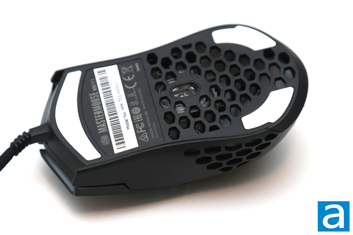 The bottom of the Cooler Master MM711 reveals the mouse feet and the sensor. The mouse feet are made up of PTFE, which is commonly known as Teflon. These give the mouse a smooth glide. I am quite happy to see Cooler Master also provide replacement feet as they can wear out. In the middle of the base is the sensor. This is the Pixart PMW3389, which is one of the top-of-the-line Pixart sensors out there. The PMW3389 tracks at high speeds of 400 IPS with acceleration up to 50g, though it is not enabled by default. Polling rate is set to a minimum 1ms, or a maximum frequency of 1000Hz, and a maximum native resolution of 16000 DPI. Unfortunately, I did notice a bit of rattling from the sensor, which could be a one-off issue since the MM710 did not suffer from this.