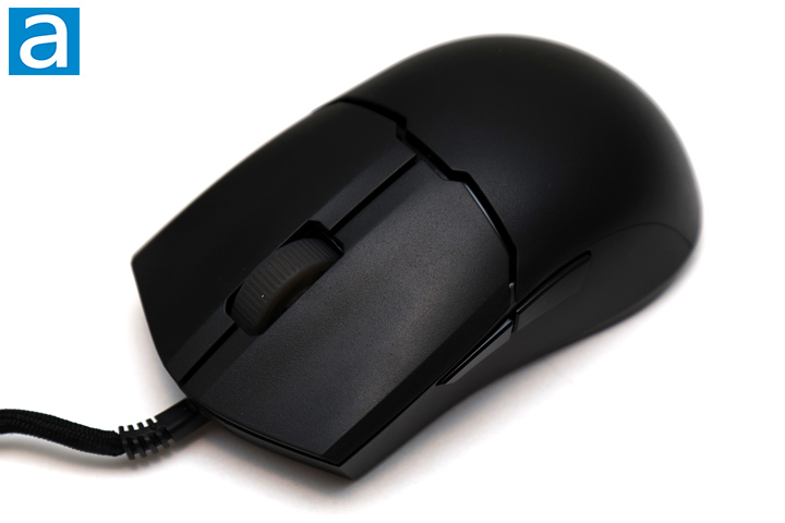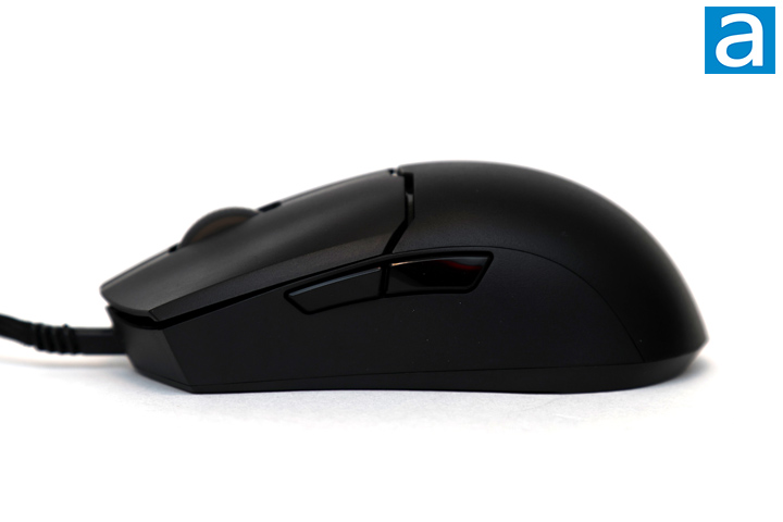 As for other buttons, in between the primary ones is a notched scroll wheel. It is a translucent smoky gray but no lighting exists here. Moving to the side buttons, we have standard forward and back on the left side. Cooler Master used notably different buttons here. The wireless MM712 used a more accented button with a protruding middle area, while this one is flatter and wider. According to Cooler Master, this should reduce any finger chafing from the buttons and make them easier to reach. They offer a good amount of travel, but they also have a slight spongy bottoming out. This is more noticeable on the back button. They are placed right under the primary button split and should be easily accessible.