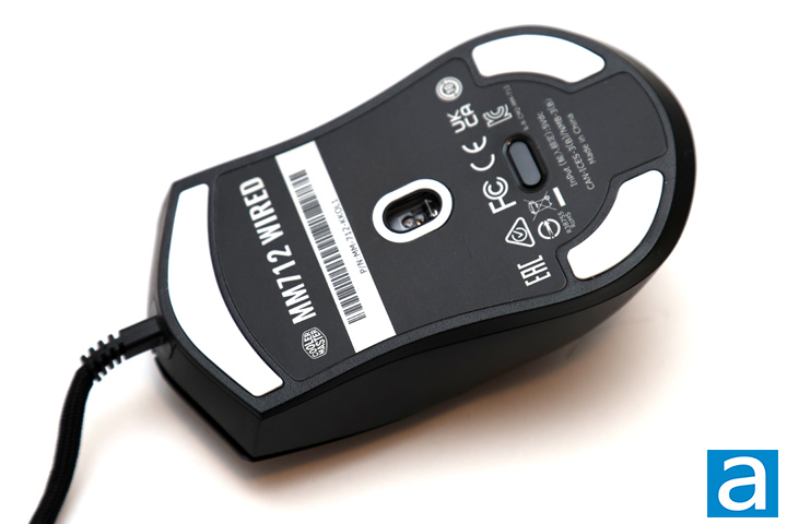 At the bottom, we can see a few more changes Cooler Master has made with the MM712 Wired. We have four polytetrafluoroethylene, or PTFE, feet that are placed in logical locations. This prevents the mouse from snagging on the surface it moves upon. Furthermore, these feet have been curved on their edges to reduce the friction between the mouse and the surface it sits upon. The other change is the fact Cooler Master has moved the sensor back to the middle. The sensor in question is the PixArt PAW3395. Users are offered a sensitivity range of 100 to 26000 DPI in 100 DPI increments. The sensor promises 650 inches per second tracking and acceleration of up to 50G. 1000Hz polling rate is standard, but can be lowered to 500Hz, 250Hz, or 125Hz. Thankfully there is no sensor or lens rattle with my unit of the MM712 Wired.