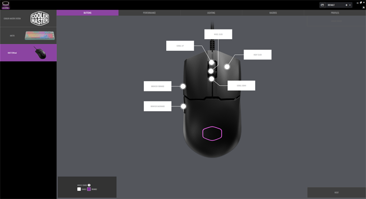 As for the MasterPlus+ software, the program generally works well. Specific to the MM712 Wired, there are a total of five different configuration pages. The first tab is marked Buttons, where you can assign different actions for each button or scroll wheel action. You can enable mouse combinations, which let you add more actions when pressed in combination with the scroll wheel button. The Performance tab lets you change the seven DPI sensitivity settings, USB polling rate, angle snapping, lift off distance, surface tuning, and other operating system-specific settings. Thankfully, you can limit the number of DPI settings enabled, as I have done so, as this reduces the number of settings the DPI button will cycle through. Finally, you can change the primary button response time, as these are optical switches. The Lighting tab lets you adjust the lighting. This provides typical LED modes such as Static, Breathing, and Color Cycle. The Macros tab is where you create and record macros to be assigned to the mouse actions. Finally, you can save up to five different profiles and settings in the Profiles tab. Unfortunately, Cooler Master has still not addressed the scaling for the font and graphics, as I found the words to be too small with respect to the overall size of the window. This is just a minor gripe, as the rest of the utility is clean and easy-to-use.
