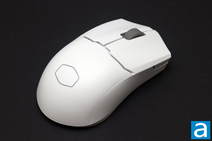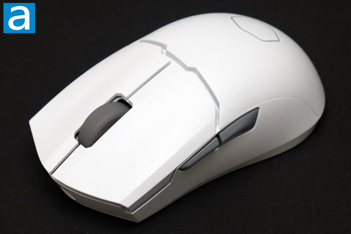 The front panel of the Cooler Master MM712's retail box had a tagline which said "Fill in the Blanks". This refers to the biggest change between the MM712 and the original MM710 or MM711. Gone are the trypophobia-inducing honeycomb areas, and in its place is a solid set of buttons and body. It is definitely neat to see how Cooler Master has kept the rest of the mouse the same, especially with its shape and size. As such, users do not need to worry about dust or water ingress protection, since this area is not easily permeable anymore. Cooler Master has kept the appearances of this mouse pretty minimal, even with this matte white finish. There are a few grey accent areas, including the side buttons and the scroll wheel, but the whole body is pretty clean. This white finish generally should resist showing handling marks, although it is an ABS plastic, so it will probably show some shine after extended use. The outline of the logo can be seen on the back, which also doubles as the single RGB lighting area.