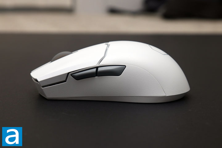 On the left side of the Cooler Master MM712, you can see all of the primary and secondary buttons. The main left and right buttons are separated from each other and the rest of the body. They are slightly sloped towards the middle of the button, which makes users naturally rest their fingers in the center. Underneath, we have primary LK Optical V2 switches with a rated lifespan of 70 million clicks. Overall, the button response and weight feel good. It is definitely different from traditional Omron switches, although the clicks are still satisfying to press. The scroll wheel is a notched wheel. As for the side buttons, we have standard forward and back buttons. They offer a good amount of travel, but they also have a spongy feel in bottoming out. This is more noticeable on the back button, despite using the same Huano switches between the two. As for their placement, they are located right above my thumb and are easy to access while keeping out of the way of accidental presses.