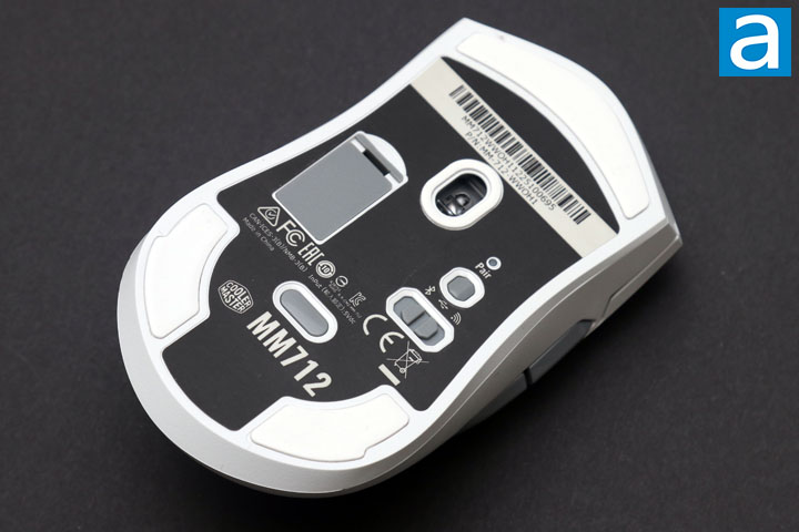 The rest of the buttons on the Cooler Master MM712 can be found at the bottom of the mouse along with the optical sensor. There are three primary areas of PFTE feet to keep the mouse gliding on any surface. An additional Teflon ring around the sensor can be seen to prevent this area from catching. The sensor in question is the PixArt PAW3370, a commonly found sensor for wireless mice. This is the same sensor found on the Cooler Master MM731. As such, users are offered a sensitivity range of 100 to 19000 DPI in 100 DPI increments. The sensor promises 400 inches per second tracking and acceleration of up to 50G. 1000Hz polling rate is standard, but can be lowered to 500Hz, 250Hz, or 125Hz. Thankfully there is no sensor or lens rattle with my unit of the MM712. Interestingly, you can see the sensor is positioned higher up than the middle of the mouse, which may affect the tracking performance with your wrist movement, although I think this is something you will need to be aware of when you use it. We will explore this later in our review.