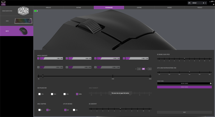 As for the MasterPlus+ software, the program generally works well. Specific to the MM712, there are a total of six different configuration pages. The first tab is marked Wireless, where users can change the sleep timer and low power mode to reduce power usage when the battery is low. The second tab is called Buttons, where you can assign different actions for each mouse button or scroll wheel action. You can enable mouse combinations, which let you add more mouse actions when pressed in combination with the scroll wheel button. The Performance tab lets you change the seven DPI sensitivity settings, USB polling rate, angle snapping, lift off distance, surface tuning, and other operating system specific settings. Thankfully, you can limit the number of DPI settings enabled, as I have done so, as this reduces the number of settings the DPI button will cycle through. Finally, you can change the primary button response time, as these are optical switches. We will explore this on the next page. The Lighting tab lets you adjust the lighting. This provides typical LED modes such as Static, Breathing, and Color Cycle. The Macros tab is where you create and record macros to be assigned to the mouse actions. Finally, you can save up to five different profiles and settings in the Profiles tab. Unfortunately, Cooler Master has still not addressed the scaling for the font and graphics, as I found the words to be too small with respect to the overall size of the window. This is just a minor gripe, as the rest of the utility is clean and easy-to-use.