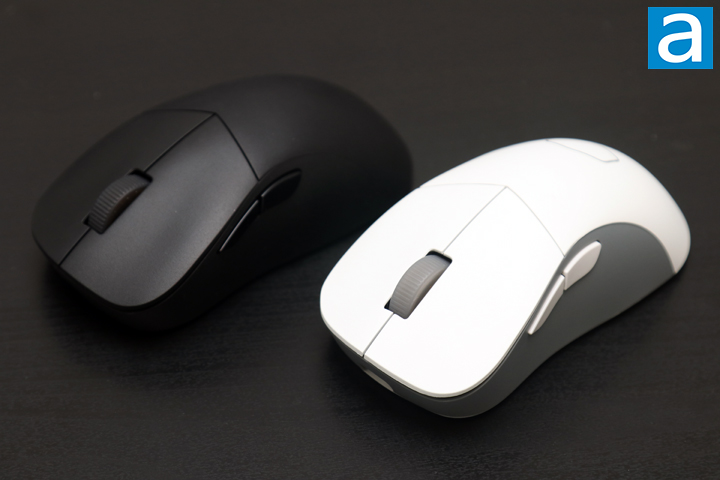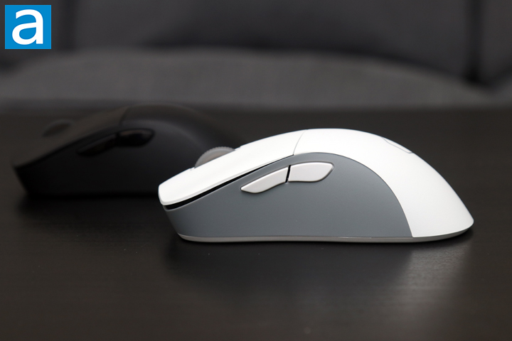 Compared to other optical switches I have felt, including the ROCCAT Burst Pro, the Cooler Master MM731 feels heavier with a slightly more pronounced click. Omron switches, on the other hand, have the sharpest click and strongest tactile feedback. In between the primary buttons is a single notched scroll wheel with a rubber surface to easily grip to. The whole wheel is a smoky gray color on both mice. On the left side of the mouse, we have two secondary buttons mapped to Forward and Back by default. These use Huano mechanical switches that feel surprisingly crisper than you might expect for side buttons. They do not have as much of a squish when bottoming out and provide good audible feedback. Finally, at the top of the mouse, you can see a USB Type-C port to plug the Cooler Master MM731 in for wired operation or for charging. It is offset enough to prevent the plug from dragging on your mousing surface.