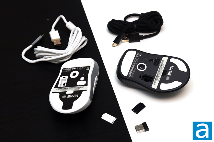 Moving on, the bottom has a few other inputs and slots. The large slot on the left is where you will find the USB dongle for wireless connection. A small plastic door lets you store the dongle inside. On the right side, we have a pairing button and a function switch. This lets users change between different operating modes, whether it is connected to your PC via Bluetooth, wireless dongle, or wired. A small LED indicator light exists above the pairing button to provide some status updates, including when you change the DPI. There is a DPI switch button at the bottom, adjacent to the serial number barcode. This lets users change the operating sensitivity on the fly. Finally, the other accessory included with the Cooler Master MM731 is the Ultraweave cable. Similar to what we have seen on other recent Cooler Master mice, this flexible and soft cable is excellent at providing a drag-free experience with your mouse without needing a mouse bungee. It still is one of the best materials I have seen on a cable and no other competitor comes close at providing as resistant-free of a cable as this one.