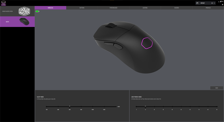 As for the MasterPlus+ software, the program generally works well. Specific to the MM731, there are a total of six different configuration pages. The first tab is marked Wireless, where users can change the sleep timer and low power mode to reduce power usage when the battery is low. The second tab is called Buttons, where you can assign different actions for each mouse button or scroll wheel action. You can enable mouse combinations, which let you add more mouse actions when pressed in combination with the scroll wheel button. The Performance tab lets you change the seven DPI sensitivity settings, USB polling rate, lift off distance, angle snapping, angle tuning, surface tuning, and other operating system specific settings. Thankfully, you can limit the number of DPI settings enabled, as I have done so. This reduces the number of settings the DPI button will cycle through. The Lighting tab lets you adjust the lighting on the MM731. This provides typical LED modes such as Static, Breathing, and Color Cycle. The Macros tab is where you create and record macros to be assigned to the mouse actions. Finally, you can save up to five different profiles and settings in the Profiles tab. Unfortunately, Cooler Master has still not addressed the scaling for the font and graphics, as I found the words to be too small with respect to the overall size of the window. This is just a minor gripe, as the rest of the utility is clean and easy-to-use.