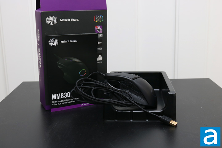 The inside of the box of the Cooler Master MM830 is quite standard. There is one large black plastic mold, which the mouse rests on. A large clear plastic mold is then placed over the mouse to keep everything in place. The cabling and the information booklets are found behind these molds. The cable is tucked nicely away behind the mouse to ensure the front looks nice and clean. The contents are quite basic, but keep the product safe during transportation. The small booklet included explains some more specifications and some basic functionality using a combination of buttons on the mouse. Specifications are also listed in detail, while the two-year warranty is explained on the back of the booklet. Overall, the retail packaging is what is expected and kept the mouse safe.