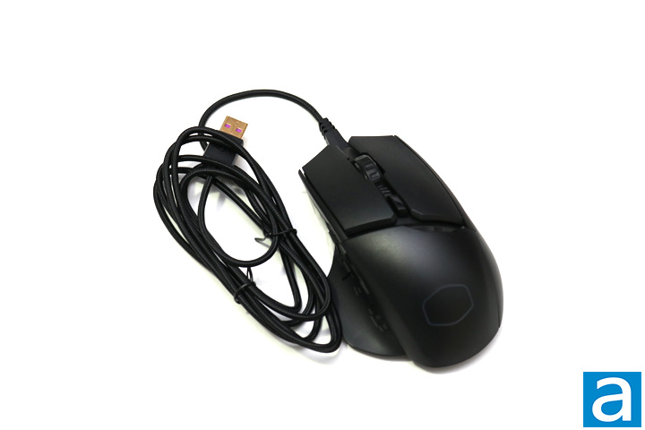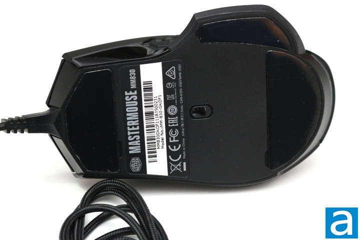 The great hardware continues on the bottom of the mouse. The sensor is a PixArt 3360, which is great. The Cooler Master MM830 is advertised as having up to 24,000 DPI sensitivity, but that can only be achieved once the firmware is updated, otherwise the mouse is locked at 12,000 DPI. The sensor is located right in the middle of the mouse, as you can see above, and the sticker with some extra information is located above it. Inside of the mouse, we find a 32 bit ARM Cortex M0 processor and 512 KB of on-board memory. This is used to save profiles and process the few different functions of the mouse. Out of the top of the mouse, we find a 1.8 m long braided cable with a gold plated connector to add that touch of class. All of this is great and Cooler Master did well to include all of these features to make a great mouse on paper.