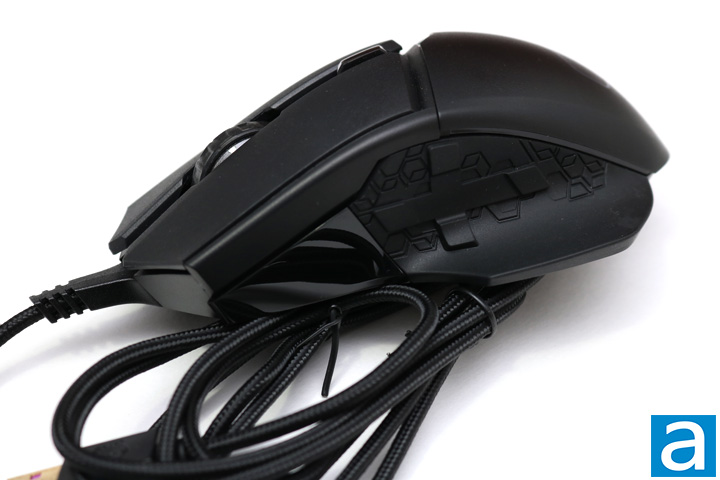 Sorry to left handed users: Its asymmetrical design means only right handed users will be able to use it. Of course, I have yet to meet anyone who is left handed and use the mouse with their left hand, and it would be quite difficult to design a mouse with one screen for both left and right handed users. The overall design of the Cooler Master MM830 is standard. The body slopes up at the front towards the middle and then slopes down again towards the back. A design like this lends itself best to a palm grip, which the MM830 is excels at. It feels great in the hand and is easy to use this way. A claw grip can also be used, although it does feel slightly less natural. A bit of a departure from traditional design are the elongated primary mouse buttons. They stretch all the way from the front of the mouse right toward the middle. When I right-click, I can feel the button slightly lift against my palm, which is kind of cool actually. Where the buttons end, there is a bit of dip, sort of like a ridge, before the last big piece of plastic covers the back. In the middle of the back piece, we find the Cooler Master logo, which is one of the lighting zones. Another departure from the traditional design is a little wing off the left side of the MM830. It is comfortable to rest your thumb on here, and it makes it very easy to reach the hidden D-pad buttons on this side. Lastly, the MM830 is made from a combination of the more durable PBT and the less impressive ABS plastic. I am not sure exactly which was used where, but the entirety of the outside of the mouse is hard plastic with a bit of a matte finish. The side with the hidden D-pad is a soft rubber, which is really comfortable. It took me a while to get used to the hard plastic all over, because I have been using the SteelSeries Rival 600, which is mostly soft rubber. However, I do still like the feel of the MM830.