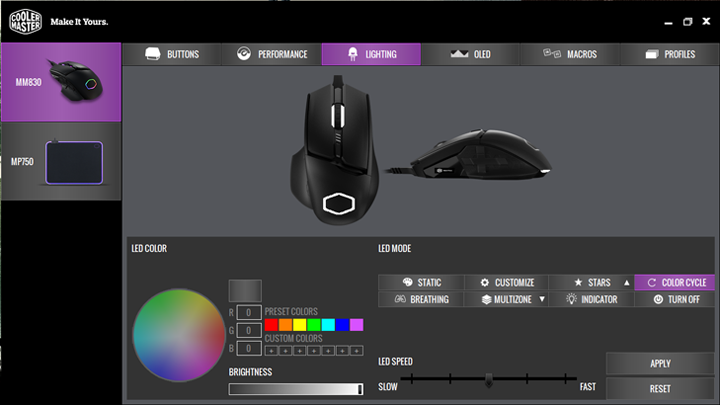 The software is located in the Cooler Master Portal used for their RGB mousepads. This is a different piece of software that is used for their keyboards and such. Cooler Master does make it clear which software to download, which is appreciated. As you can see in the above picture, the Cooler Master MasterAccessory MP750-L, is located along the left to easily switch between different Cooler Master products. The first tab the software is open to is the lighting tab. This is to control all the LEDs on the mouse. Cooler Master provides some cool looking effects, with two I have never encountered before. They are named sky and star. Sky makes it so a white color illuminates different parts of the Cooler Master logo at random intervals. Part of the logo, a small part, will almost breathe with a white LED for a short while. Star does the same, except it turns off a part of the LED, making part of the Cooler Master logo dark. The lighting effects are mostly straightforward except for the lighting zones. I have no idea how they work and could not figure it out.
