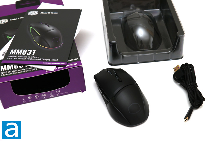 Inside the package, the Cooler Master MM831 is stored in a plastic shell. A braided USB to USB Type-C cable measuring 1.8m in length is also included. Cooler Master has also packed two sheets of documentation with information regarding the setup, especially to help with the wireless portion of this mouse. There is also safety and warranty information included here. Cooler Master offers a two-year warranty on this mouse, which is similar to other manufacturers.