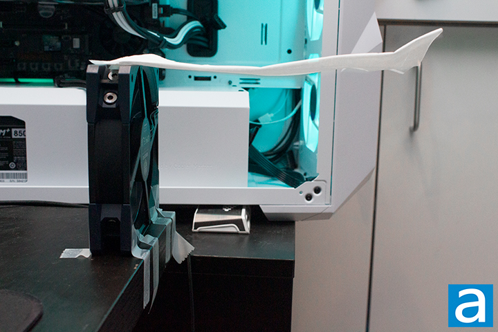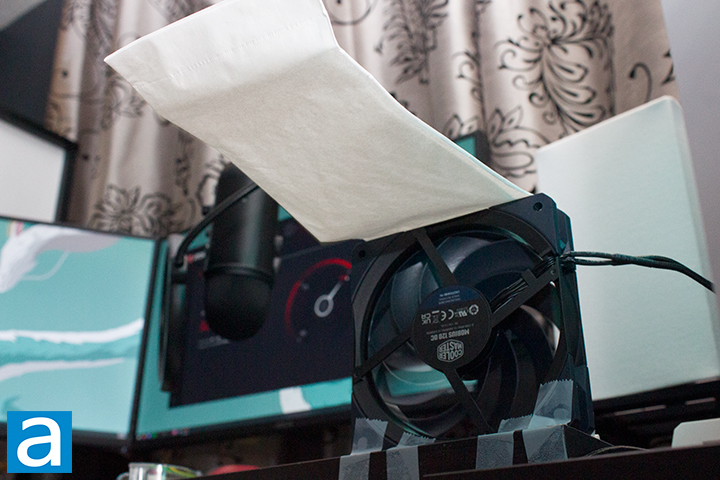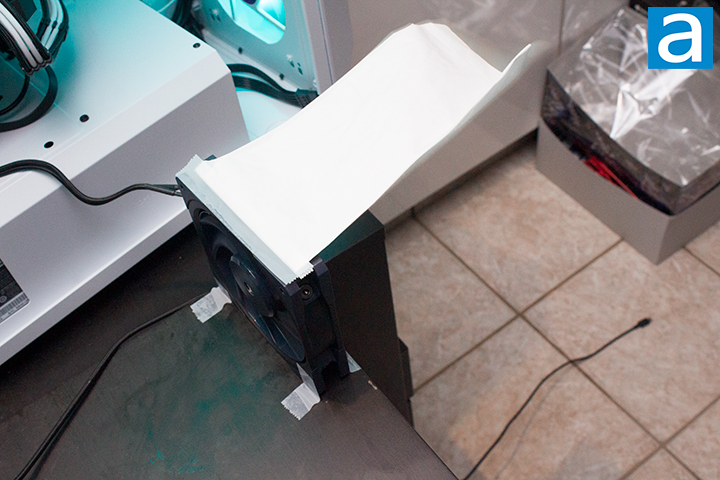 To test the performance of both the Cooler Master Mobius 120 OC, our testing method invented right here at APH Networks was used. Although this test may not be the most comprehensive of tests, the results are qualitatively displayed at a minimum cost by using a piece of tissue paper and tape. As shown in the above photos, a piece of tissue paper was attached on the top of a fan. The tissue paper should be able to naturally fall down and cover the air outlet side -- the side where the motor rack is located -- of the fan. The fan is placed on the edge of a table to prevent air from reflecting off any other surface to not skew results. Once the fans were powered on, the airflow, airflow consistency, and the amount of static pressure can be evaluated by observing the behavior of the tissue paper. Note that the images above were taken using the high setting on the fan speed toggle.