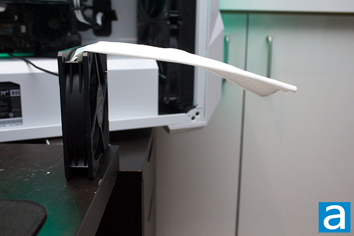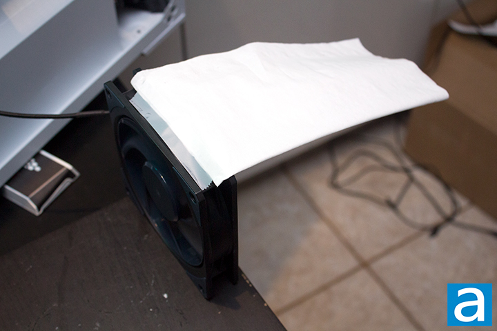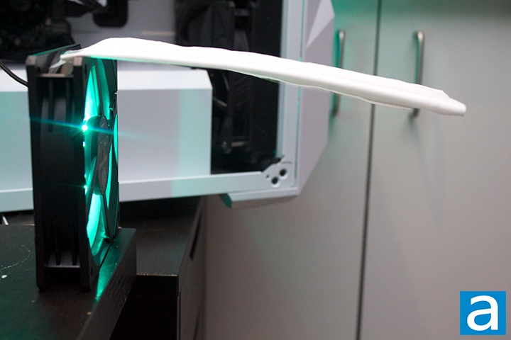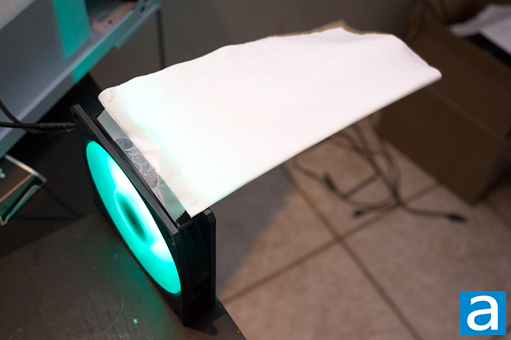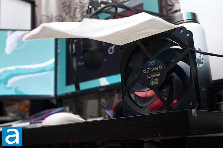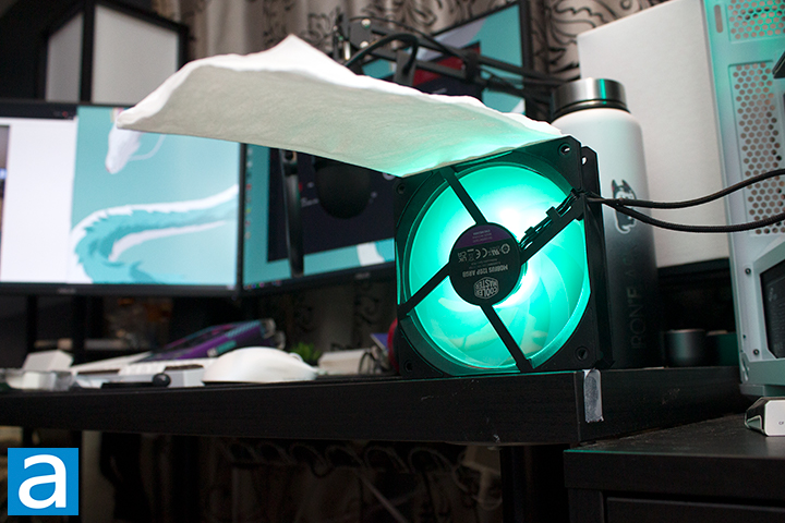 To test the performance of both the Cooler Master Mobius 120P ARGB and Mobius 120, our testing method invented right here at APH Networks was used. Although this test may not be the most comprehensive of tests, the results are qualitatively displayed at a minimum cost by using a piece of tissue paper and tape. As shown in the above photos, a piece of tissue paper was attached on the top of a fan. The tissue paper should be able to naturally fall down and cover the air outlet side -- the side where the motor rack is located -- of the fan. The fan is placed on the edge of a table to prevent air from reflected off any other surface to not skew results. Once the fans were powered on, the airflow, airflow consistency, and the amount of static pressure can be evaluated by observing the behavior of the tissue paper.