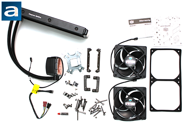 Pulling everything out of the box, you will notice all the corresponding parts are organized neatly in bags. I simply took the liberty to take all the small parts out and have laid them together accordingly to their respective piles. You will receive mounting brackets for Intel and AMD sockets with their respective screws already mounted. Additionally, you will receive the backplate, two fans, a Y-splitter, thermal paste, rubber dampening grommet, manual, and warranty information. Of course, you will find the Nepton 240M itself.