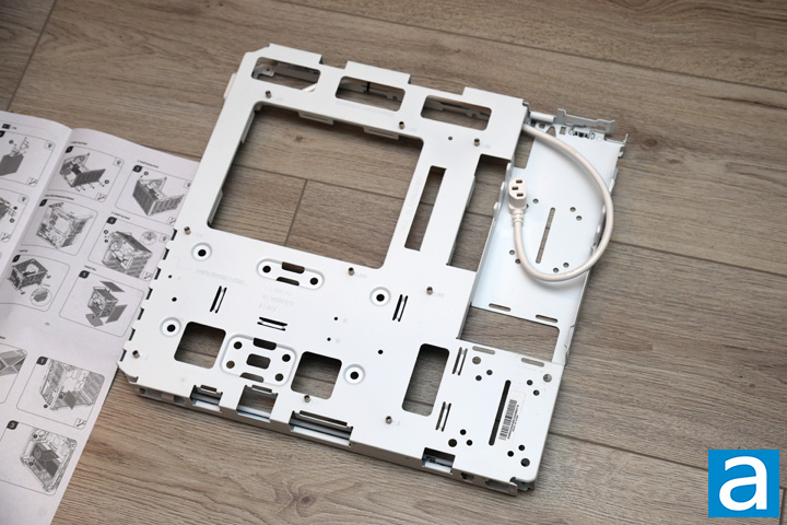 As we have mentioned already, we received the white edition of the Cooler Master QUBE 500 Flatpack, so nearly every component here is white in color. The first step starts with the motherboard backing plate, where users can mount their motherboard to. Out of the box, a set of silver standoffs are installed for the typical ATX motherboard form factor. However, users can install anything from mini ITX to extended ATX. On the larger end, the motherboard is limited to 273mm in width with an ATX power supply or 296mm with an SFX power supply. This is because the power supply sits on the right side of the motherboard. Otherwise, at the back, we have a large cutout for users to have access to the back of the motherboard. This is helpful when you are changing your cooling options, as you will often require access to the backside to change the backplate. Some motherboards also have M.2 sockets on the back for you to expand storage. Around this plate are many different cutouts for routing cables around. None of them are lined with rubber grommets, but they are rounded over to prevent users from accidentally getting cables or fingers cut by the edges.